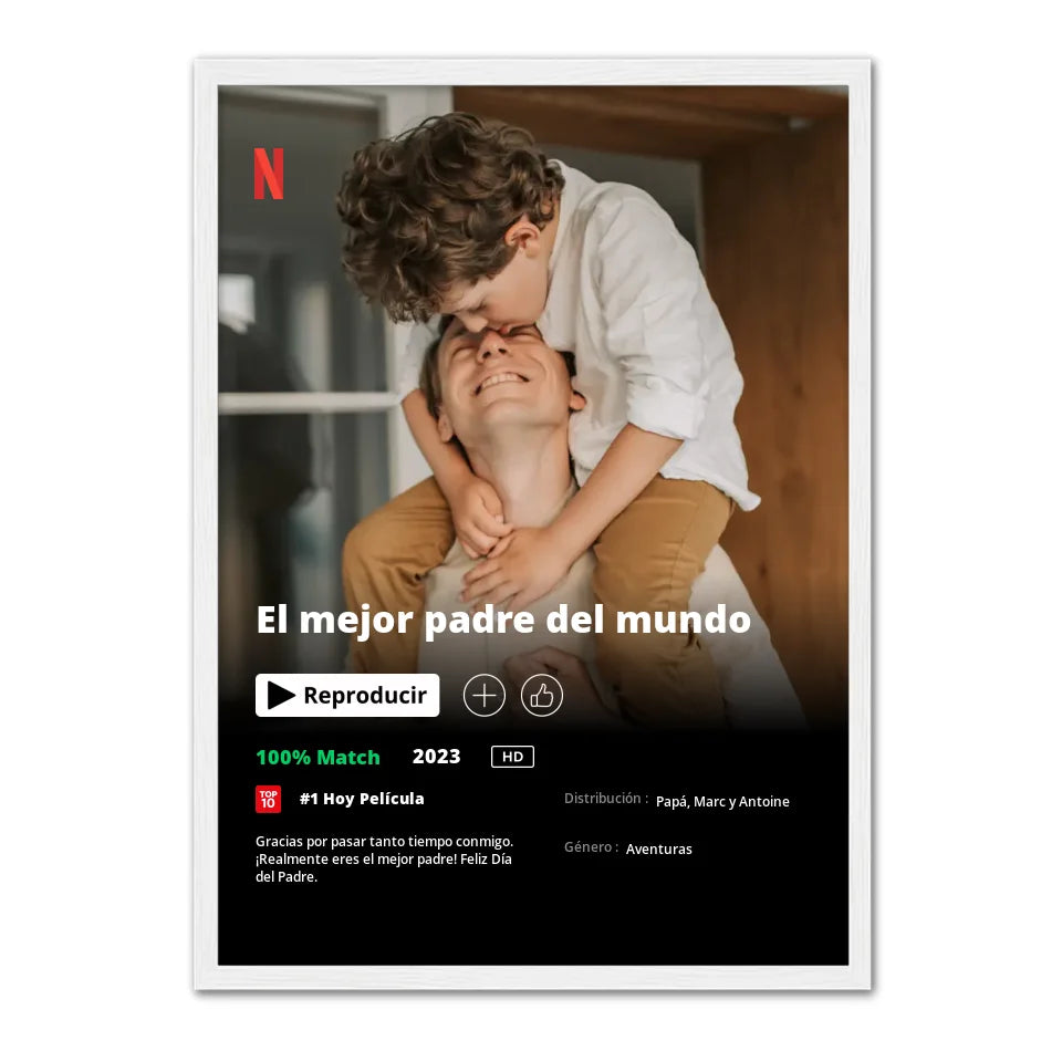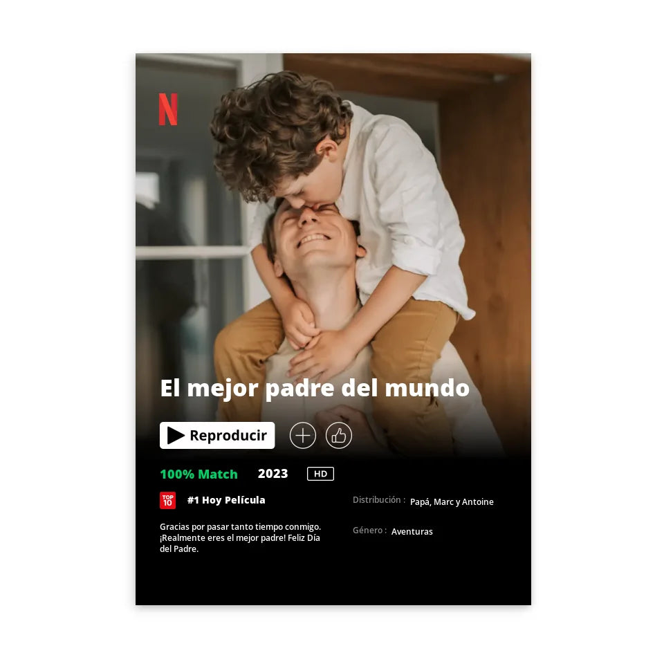 Celebra a la increíble figura paterna en tu vida con nuestro póster de Netflix "El Mejor Padre del Mundo" 🌍❤️. Esta conmovedora obra de arte captura la esencia del vínculo especial entre padre e hijo, lo que lo convierte en el regalo perfecto para el Día del Padre. Personalízalo con tu propio mensaje de agradecimiento 💌, una fotografía entrañable, o selecciona de nuestra galería de tiernos momentos entre padre e hijo. Tu padre quedará impresionado y conmovido hasta lo más profundo de su corazón 💖.