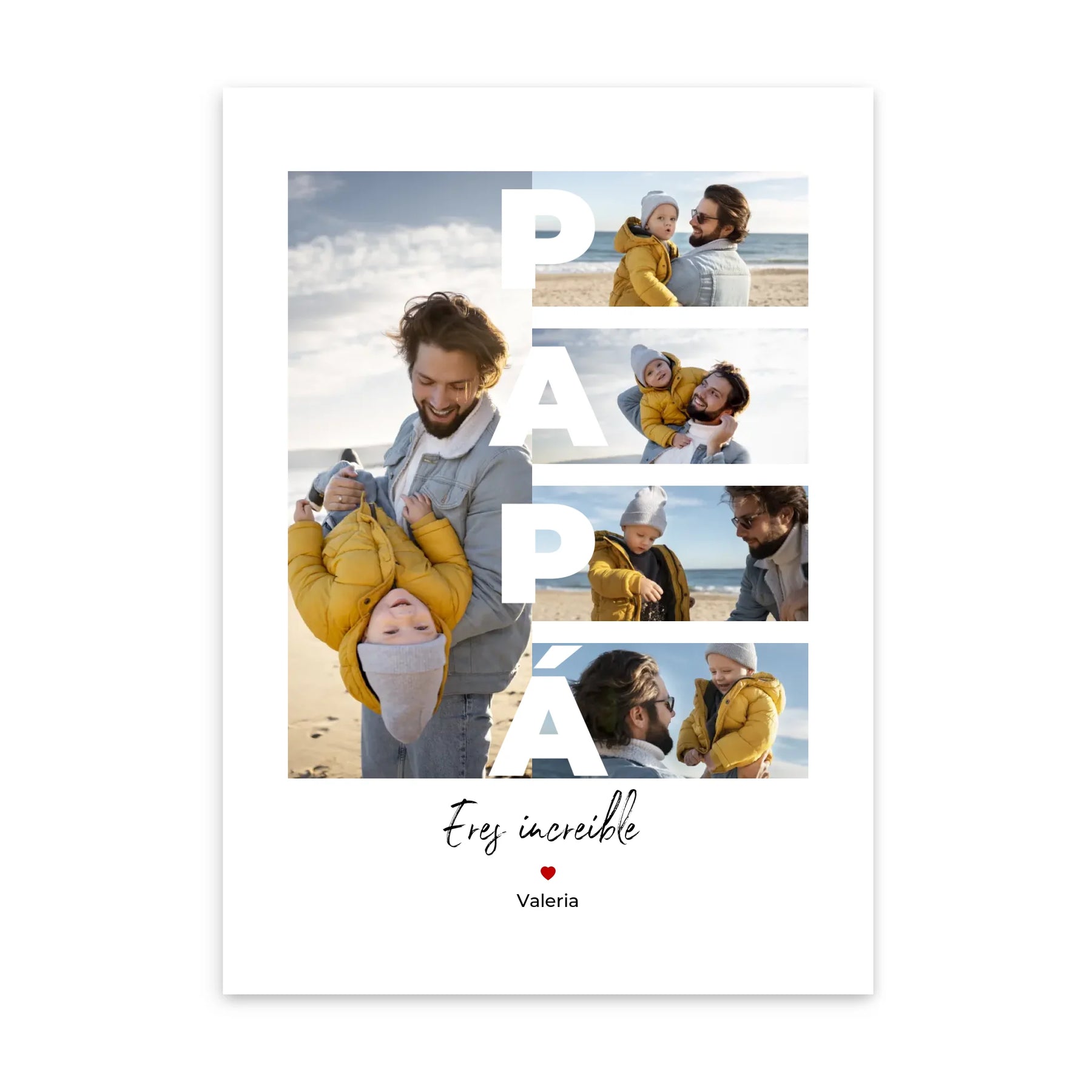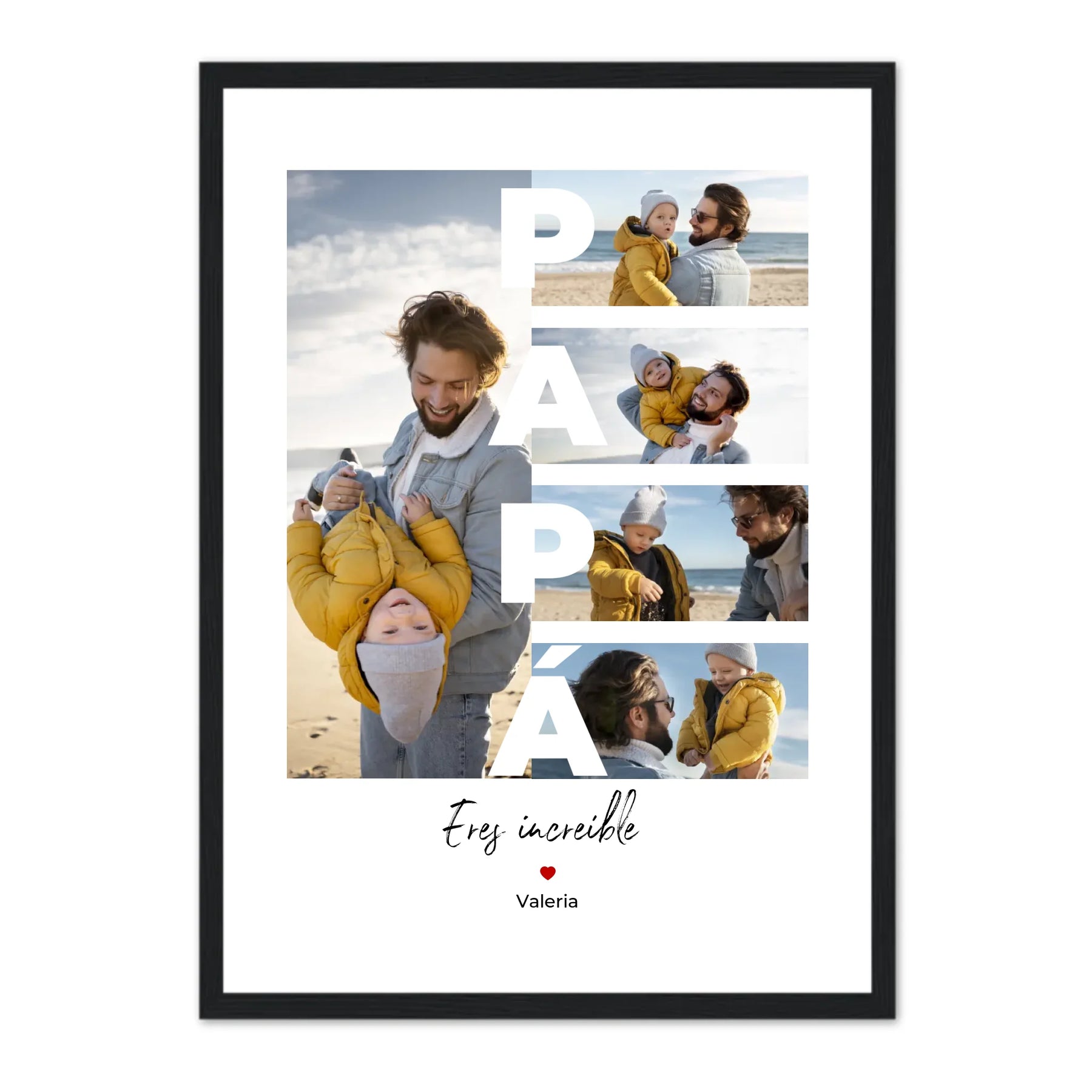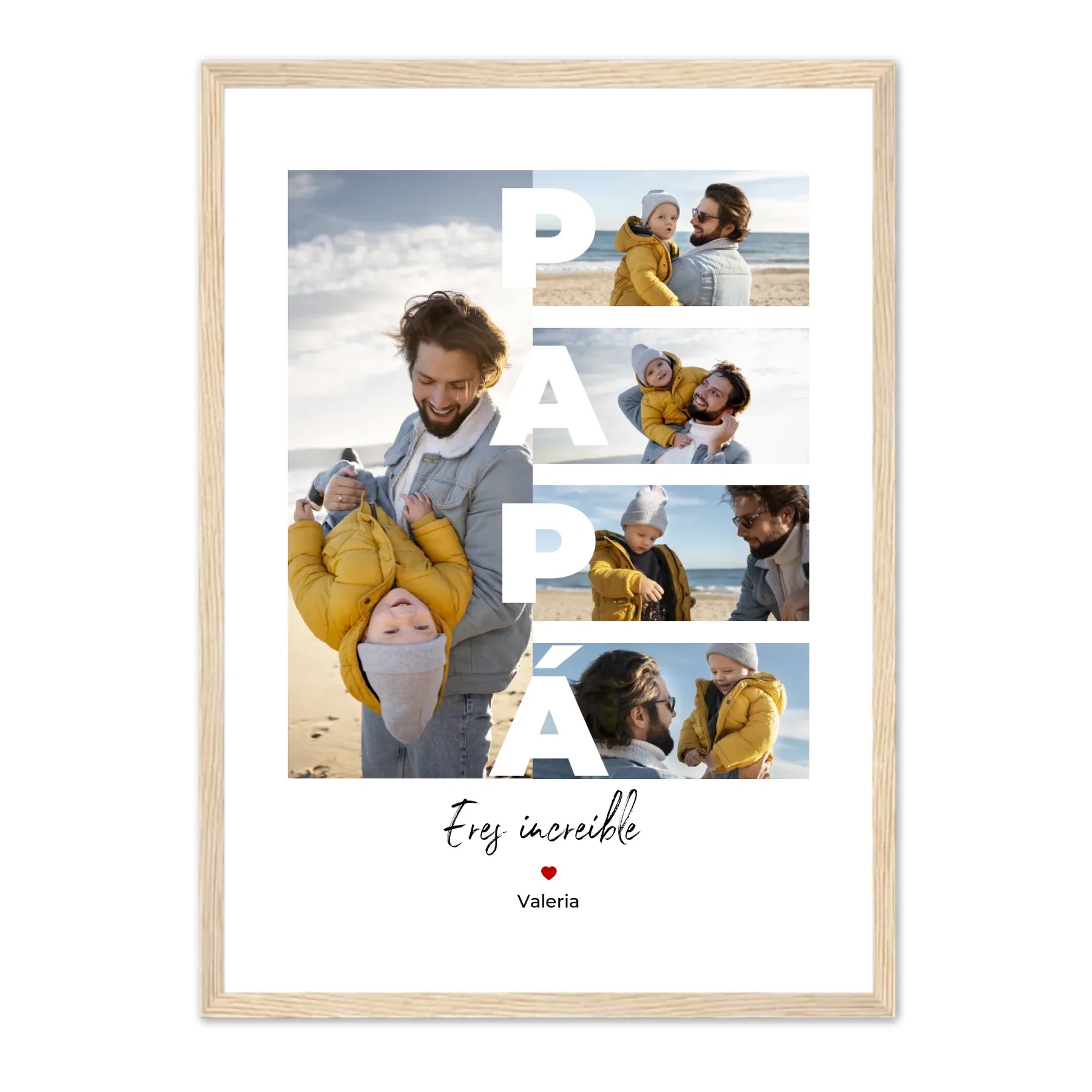 Regala a tu padre un homenaje inolvidable con este magnífico collage de fotos personalizado.  Cada foto recoge vuestros momentos favoritos juntos. Imagina su reacción cuando descubra esta obra de arte llena de recuerdos preciosos que podrá admirar todos los días en casa.