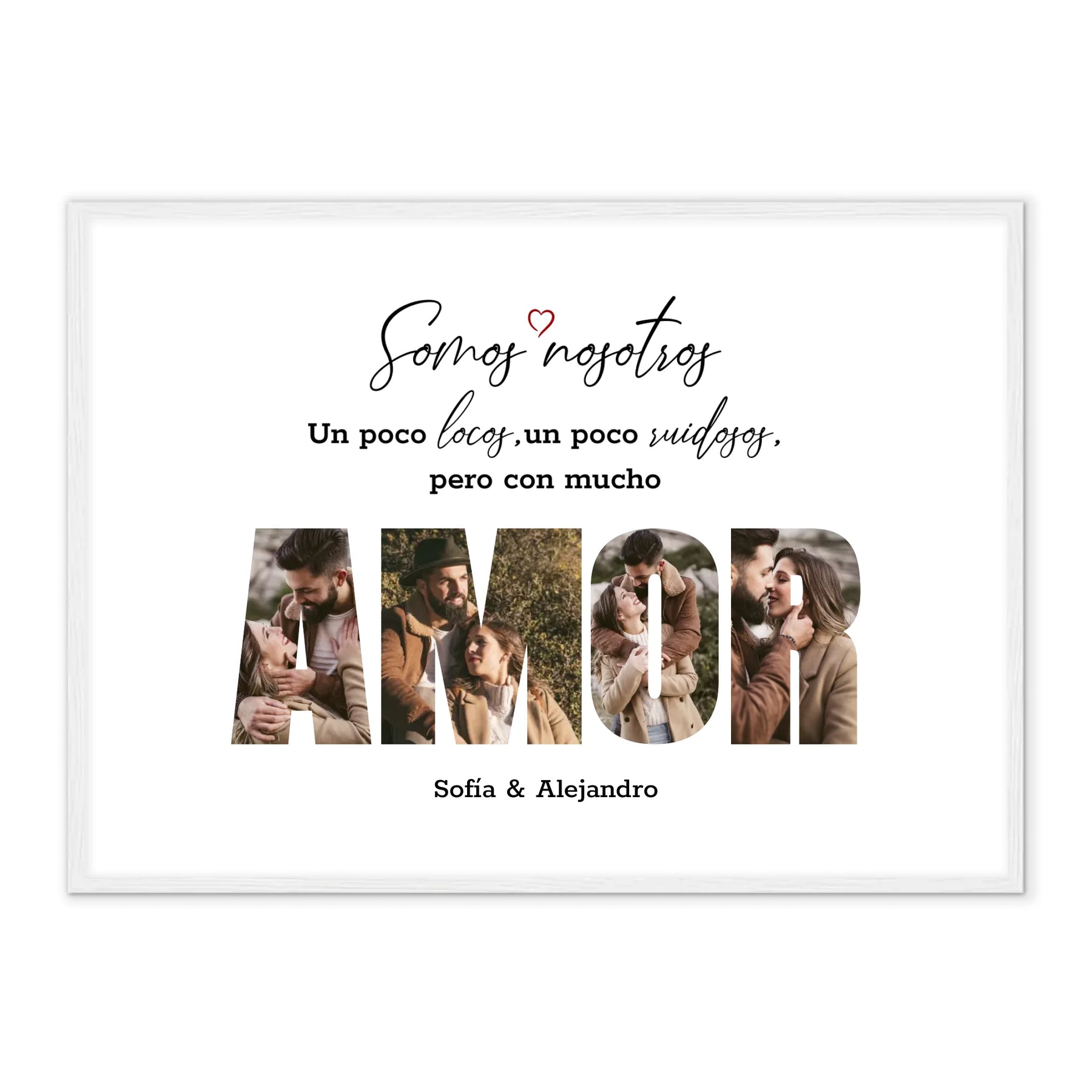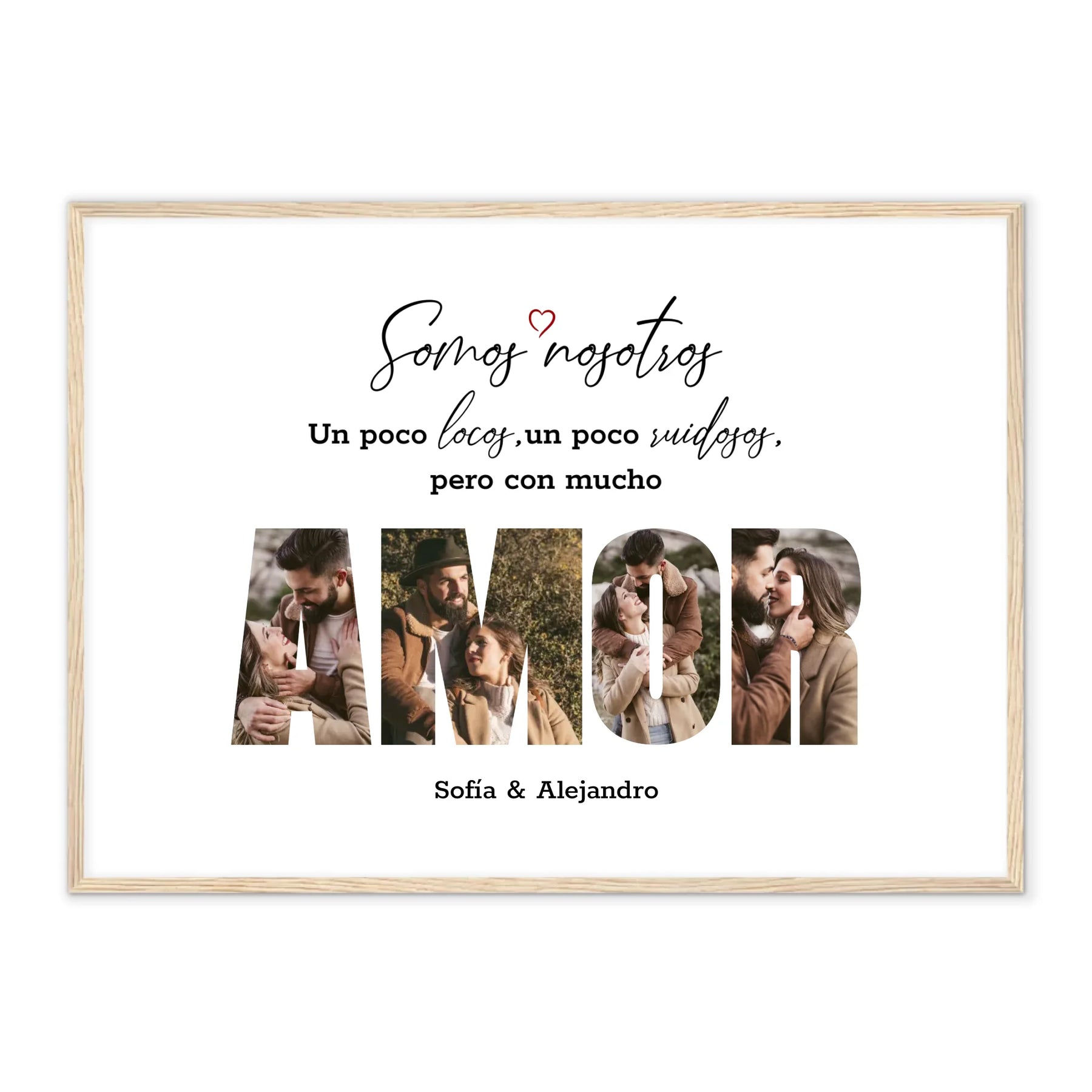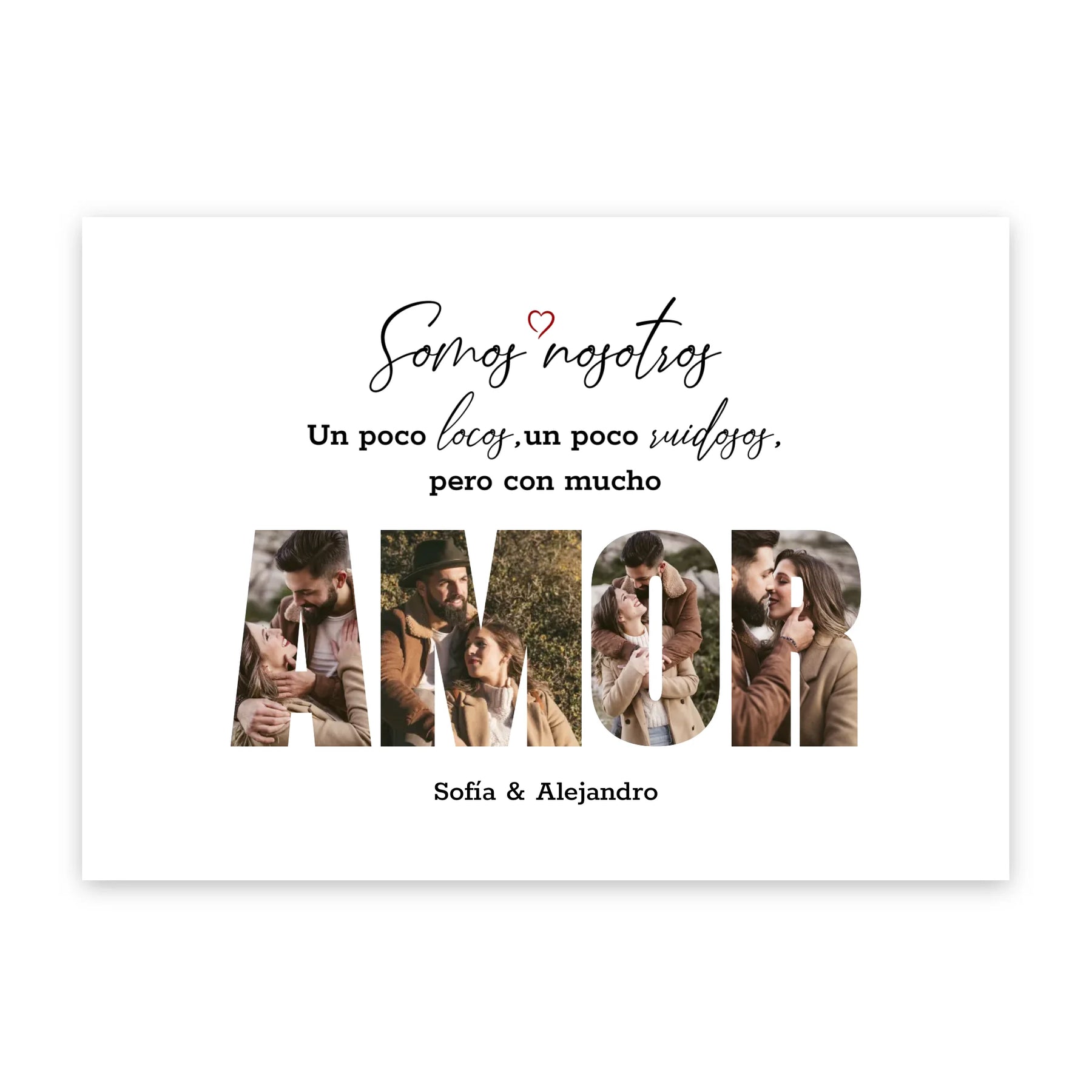 Celebra tu amor único con nuestro diseño personalizado. Este diseño creativo pone en primer plano tus fotos preferidas en el interior de las letras audaces de «AMOUR», acompañadas de una leyenda a la vez lúdica y conmovedora que capta la esencia de tu relación. Puedes personalizar los nombres para crear una pieza única. Tanto si es para tu casa como si es para regalar, esta foto es una bonita muestra de la relación alegre y llena de amor que compartís.