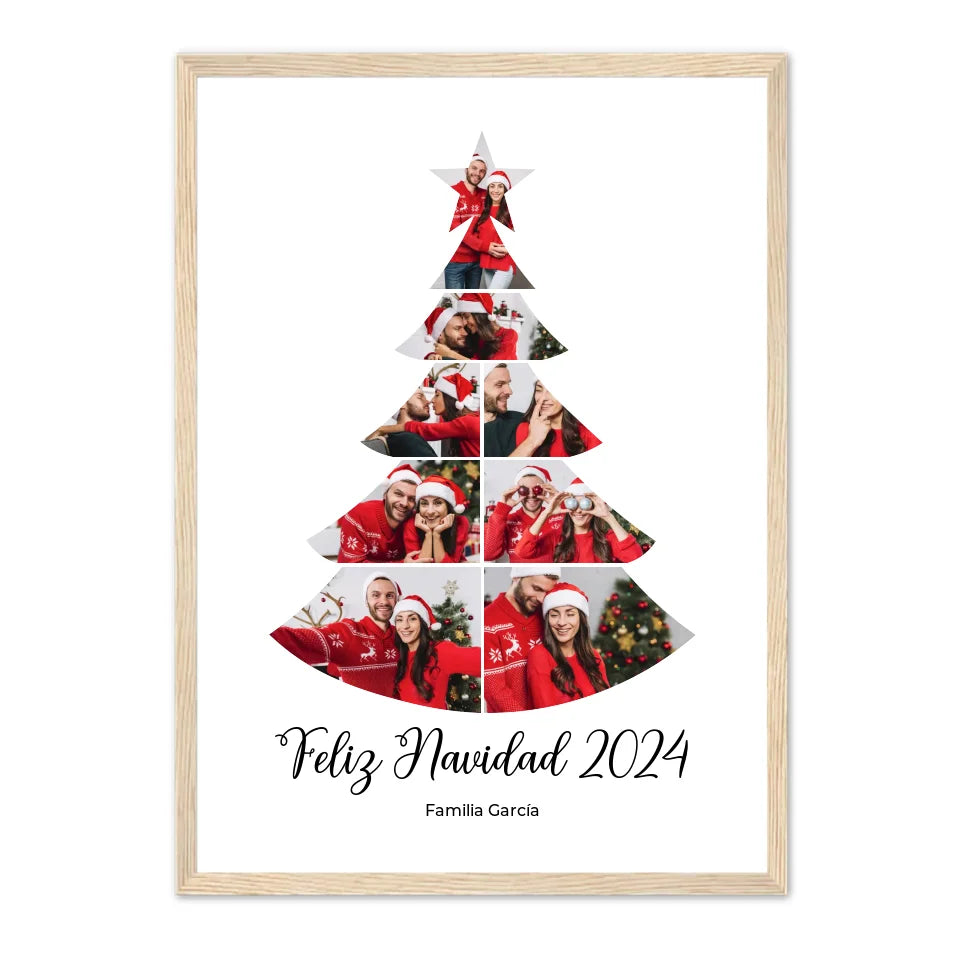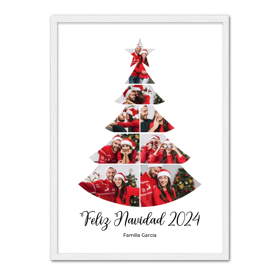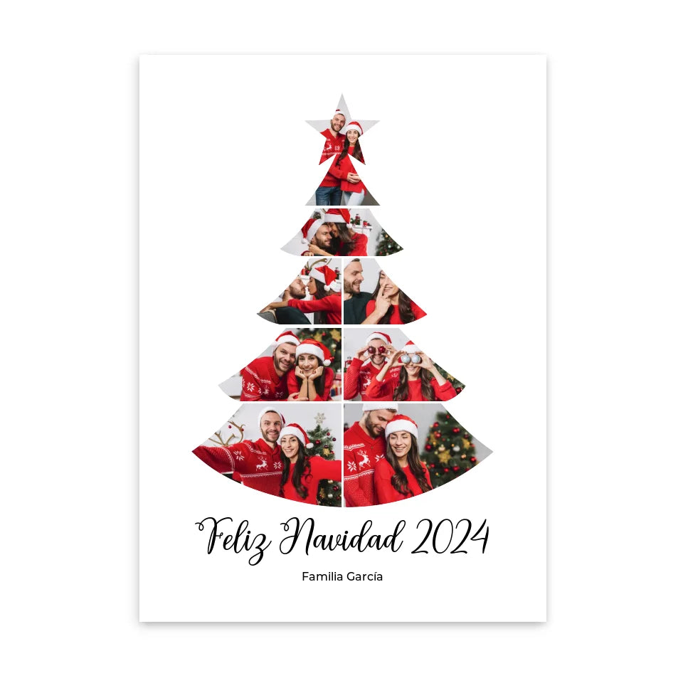 Celebra la calidez de las fiestas con un póster navideño personalizado que da vida a tus recuerdos familiares. Esta obra de arte festiva, con forma de árbol de Navidad, muestra tus fotos más preciadas en una bonita composición, lo que la convierte en la decoración perfecta para la temporada. Personalízala con el nombre de tu familia y tus fotos favoritas para crear un recuerdo único que iluminará tu hogar cada Navidad. Ideal como regalo o para complementar tu propia decoración, este póster captura el amor y la alegría compartidos en familia. Cada mirada que le eches te traerá recuerdos de unión y alegría festiva. Dale a tu hogar un toque de magia personalizada esta Navidad.