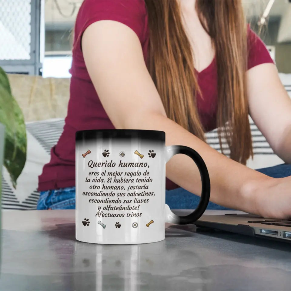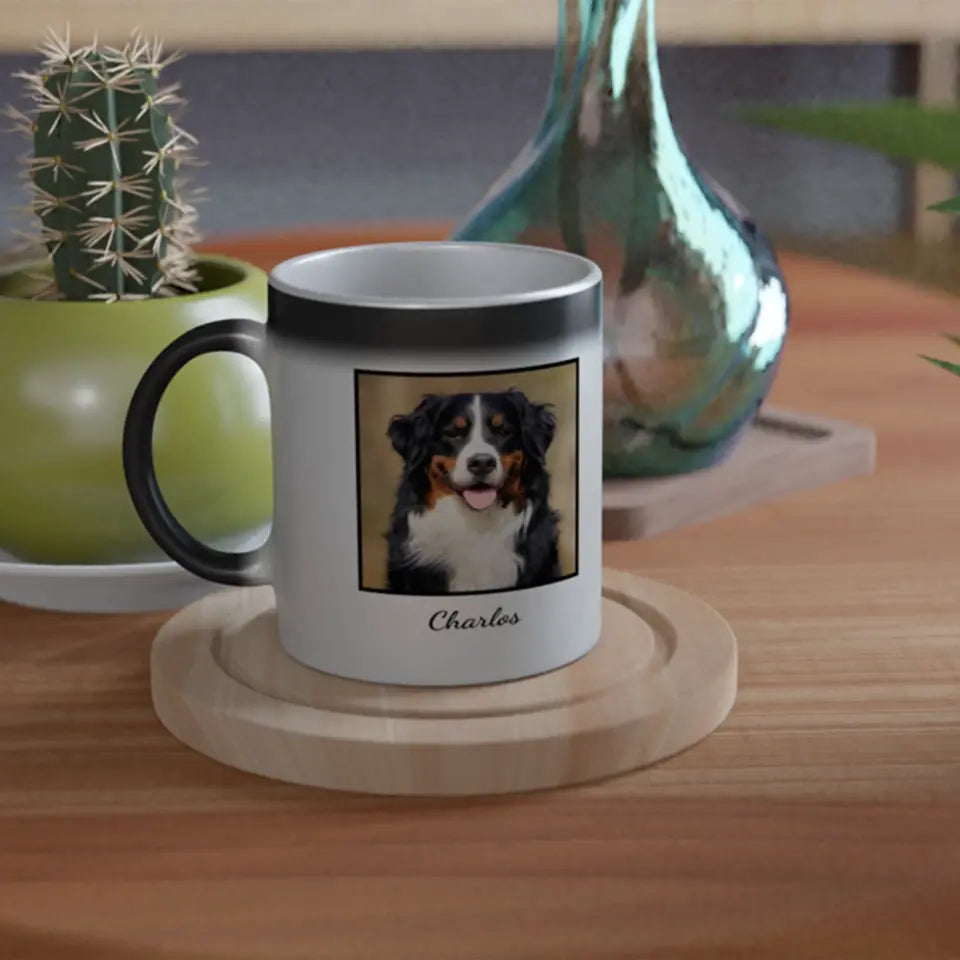 Descubra el encanto de sus amigos peludos favoritos con nuestra taza mágica personalizada. Esta taza única tiene un revestimiento especial sensible al calor que revela una deliciosa sorpresa cuando se llena de líquido caliente. A temperatura ambiente, es una elegante taza negra. Sin embargo, vierta su bebida caliente y observe cómo se produce la magia, revelando una imagen personalizada de su querida mascota