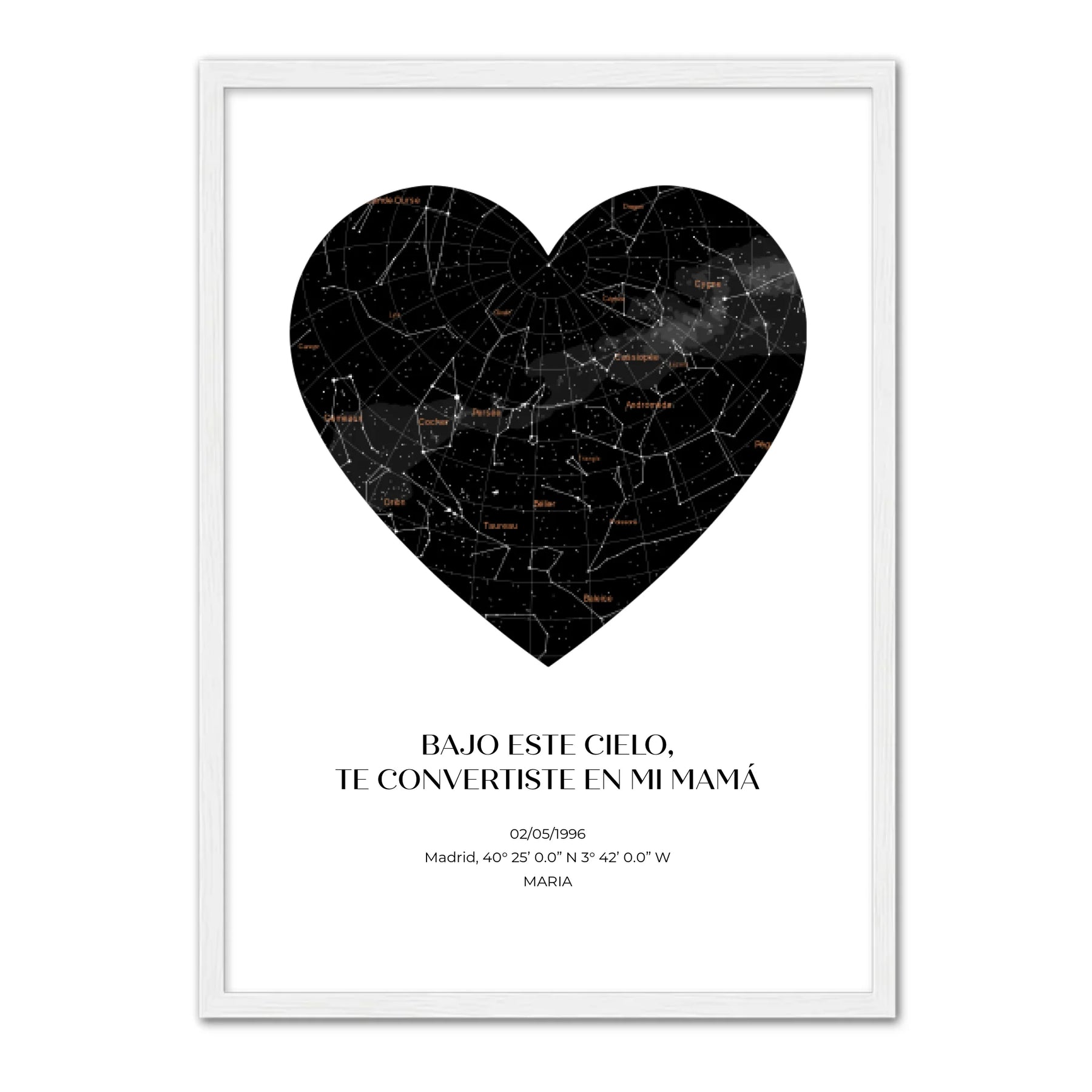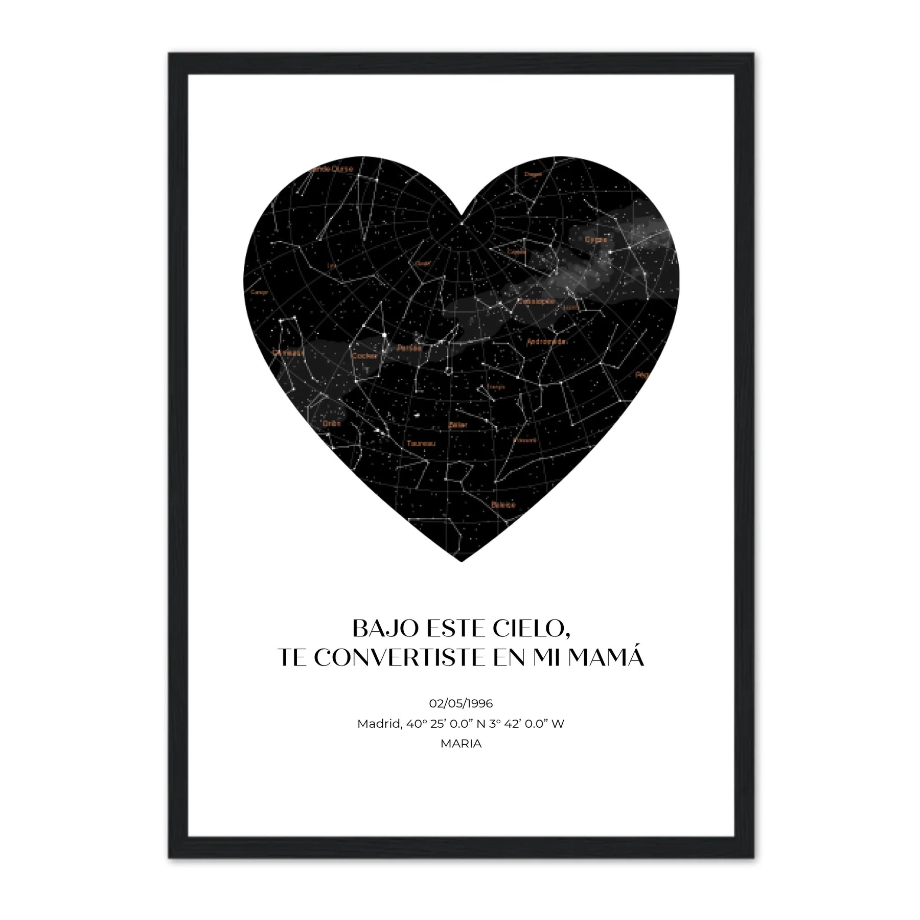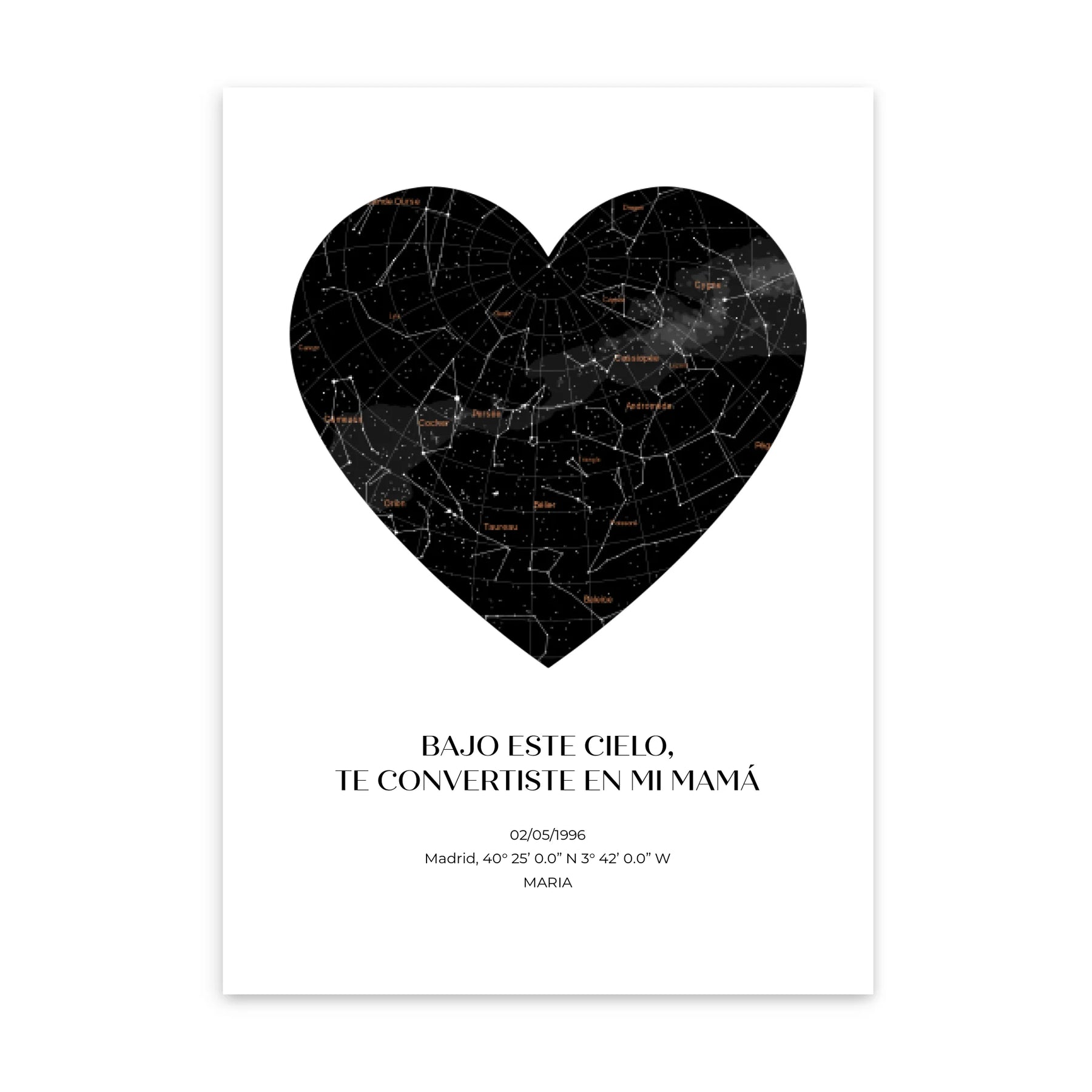 Captura el cosmos del día en que el universo te regaló a la mamá más estelar con nuestro mapa estelar personalizado.  Observa las constelaciones tal y como eran en una fecha especial para ti, especialmente personalizada para celebrar a tu madre.  Ya sea el día en que la llamaste «mamá» por primera vez u otro momento compartido en el tiempo, esta obra de arte la transportará a ese mismo día, bajo ese mismo cielo.