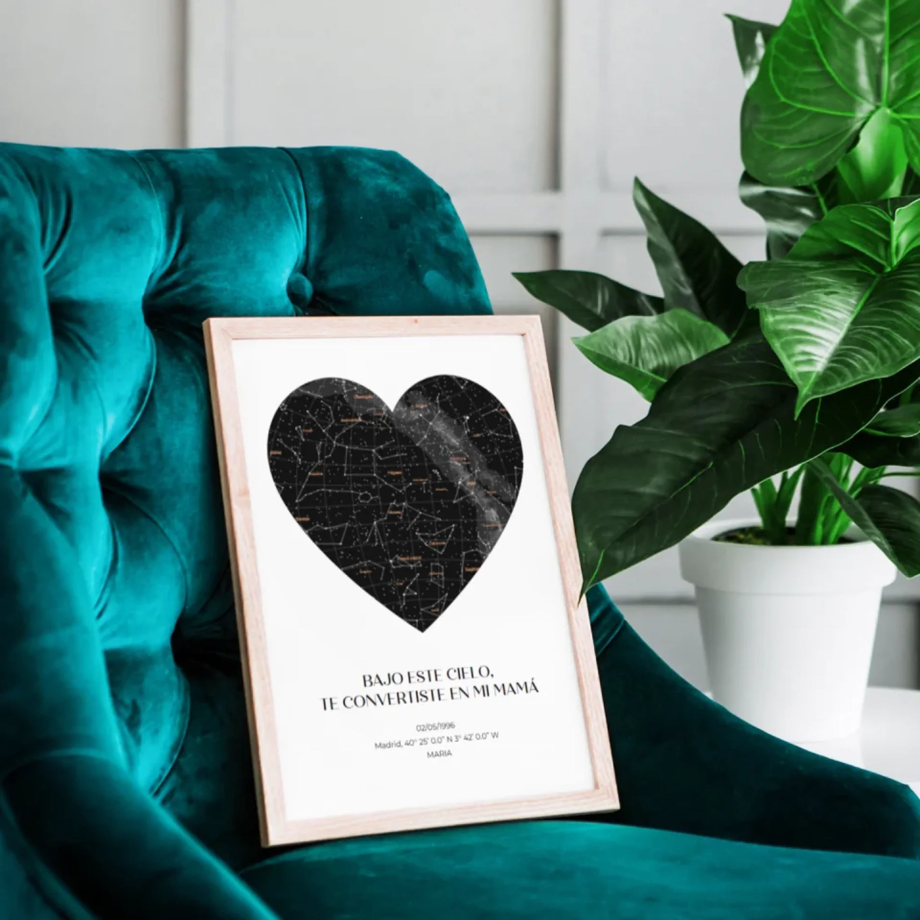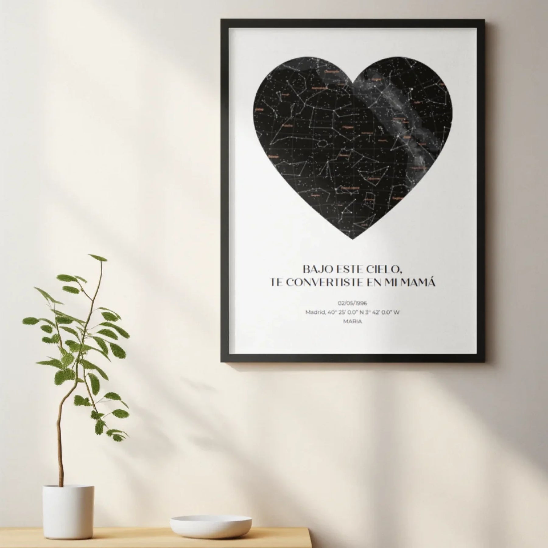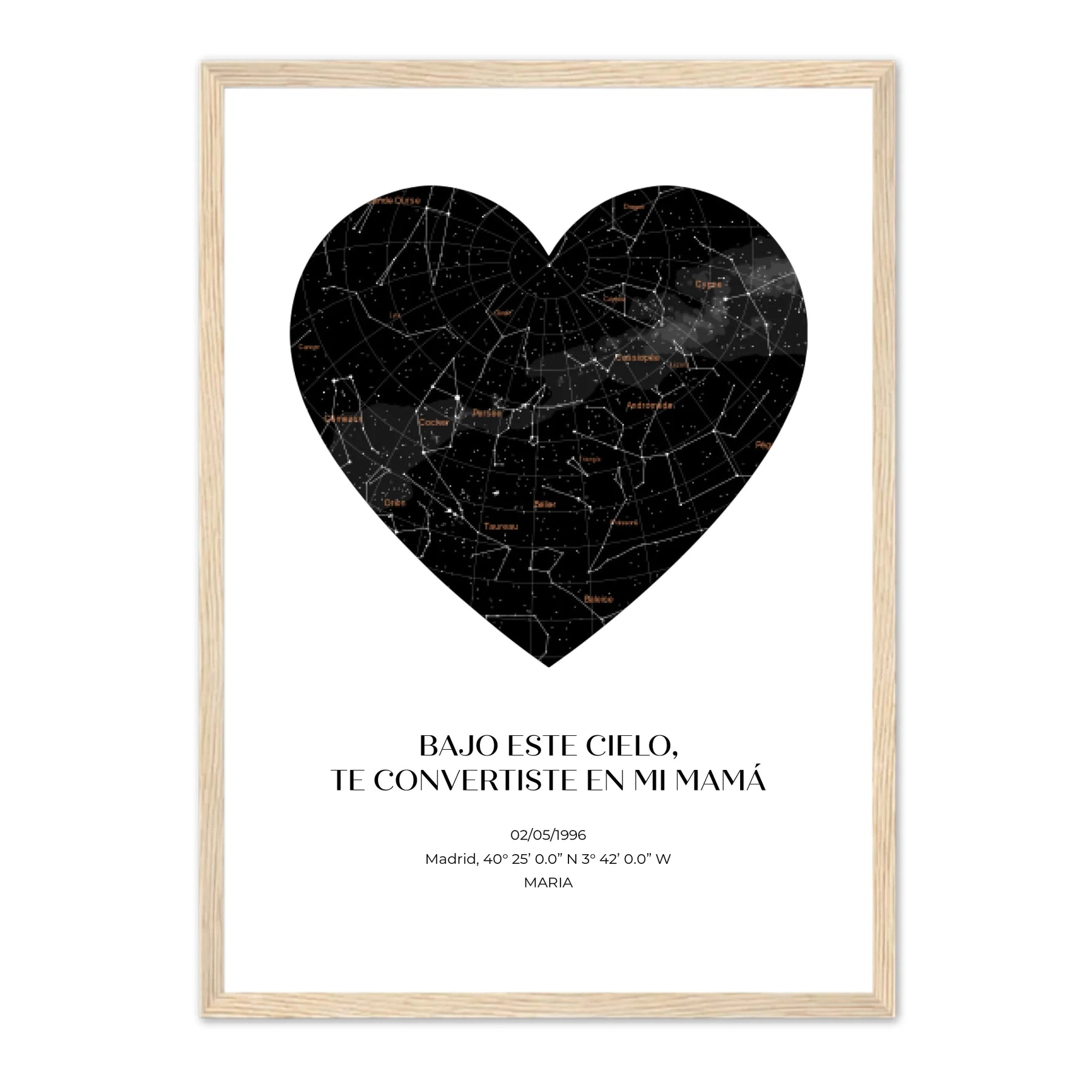 Captura el cosmos del día en que el universo te regaló a la mamá más estelar con nuestro mapa estelar personalizado.  Observa las constelaciones tal y como eran en una fecha especial para ti, especialmente personalizada para celebrar a tu madre.  Ya sea el día en que la llamaste «mamá» por primera vez u otro momento compartido en el tiempo, esta obra de arte la transportará a ese mismo día, bajo ese mismo cielo.