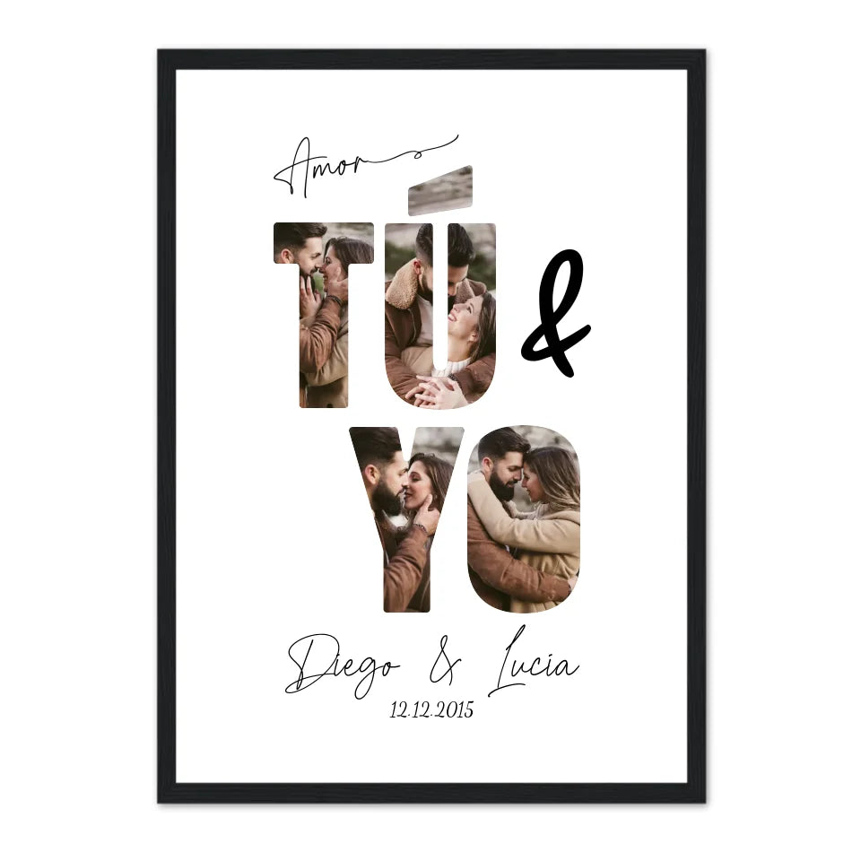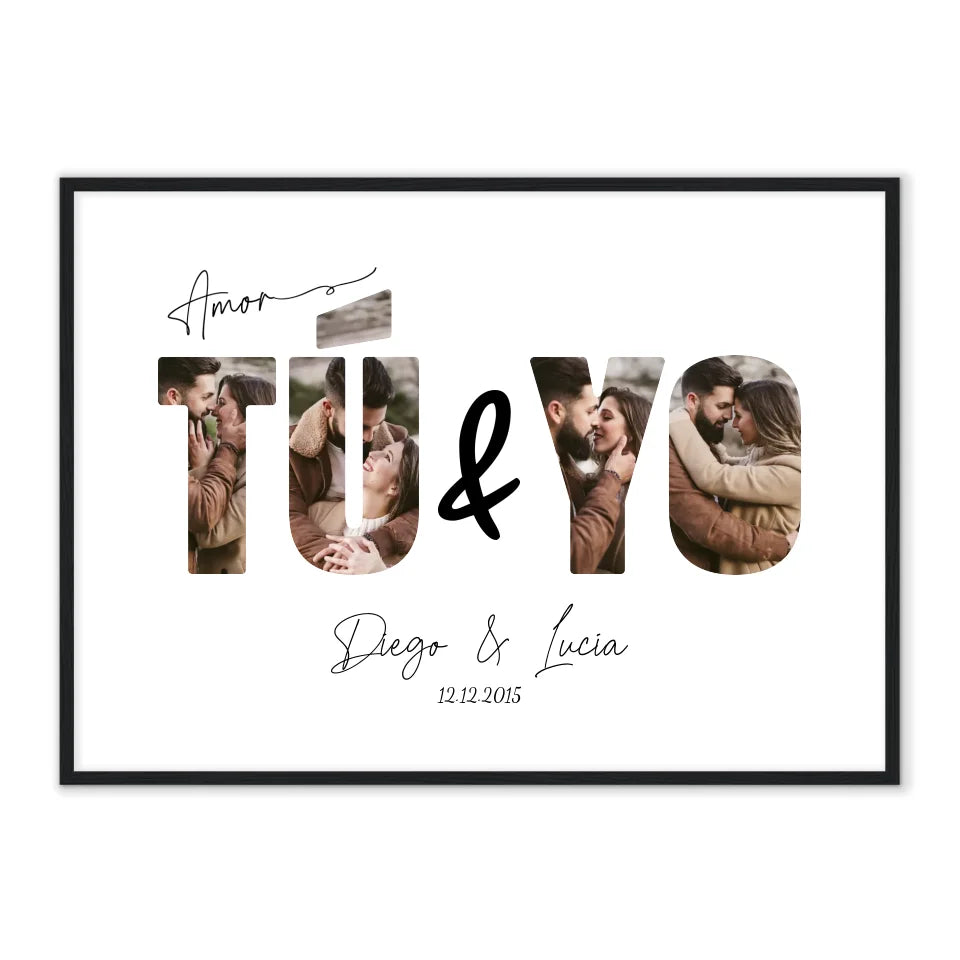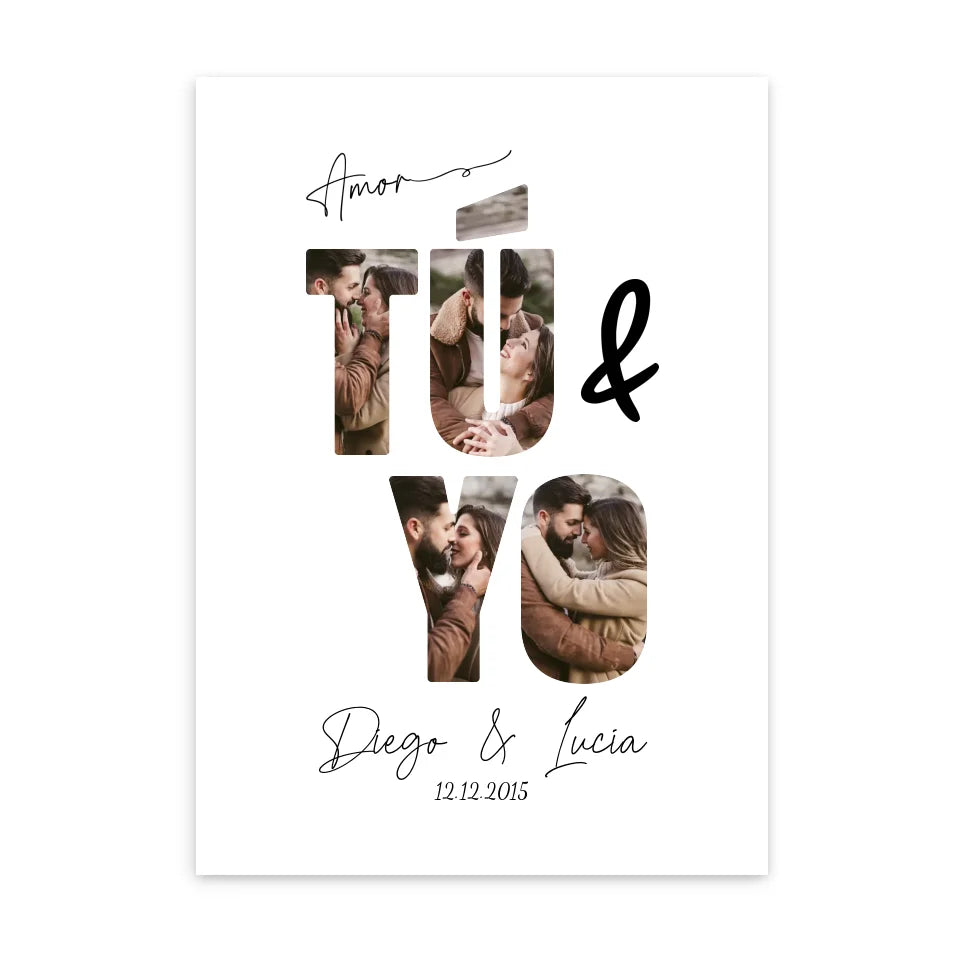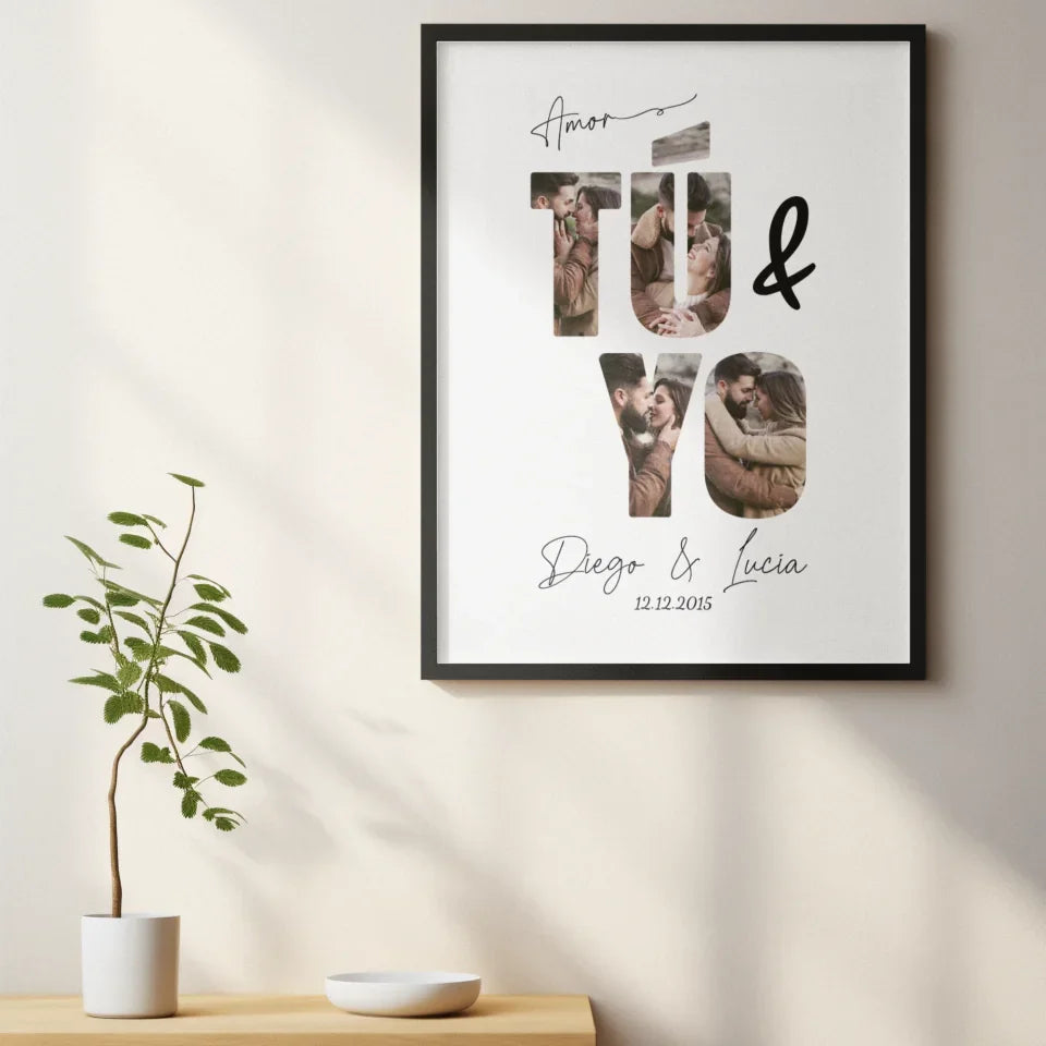 Inmortalice su historia de amor con nuestro póster personalizado "Tú  y yo". Esta pieza encantadora y romántica captura perfectamente la esencia de su relación a través de una colección de sus momentos más memorables juntos. Cada foto está artísticamente colocada dentro de las letras "TÚ Y YO," simbolizando la unidad y el vínculo eterno entre ambos.